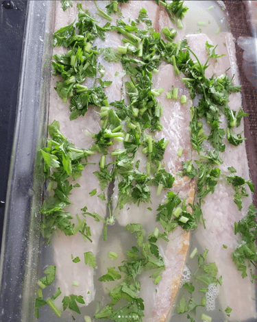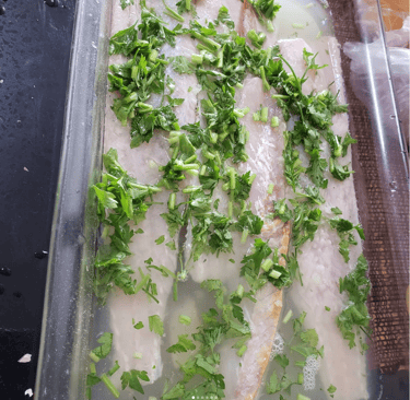 Em um recipiente, marine os filés de peixe no suco de limão, salsa picada e no tempero para peixe por 15min.