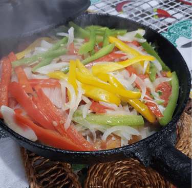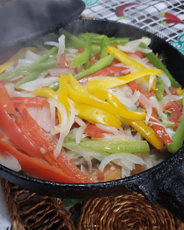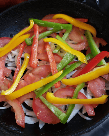 Por cima dos filés, adicione o restante da cebola, pimentões e tomates.