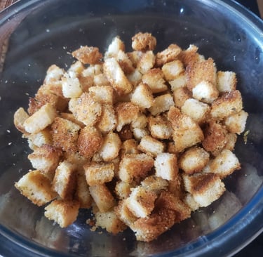 Crocança e Sabor: Nossos croutons caseiros de alho e orégano dão o toque crocante que faz a diferença. Pode ser substituídos por batata palha, nozes ou castanho-de-caju, tortilla chips ou nachos, grão de bico assado.