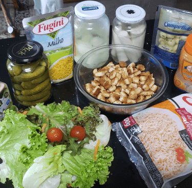 Higienize em água abundante todos os ingredientes em conserva para que tire o gosto do caldo da conserva, corte em fatias ou a gosto.
