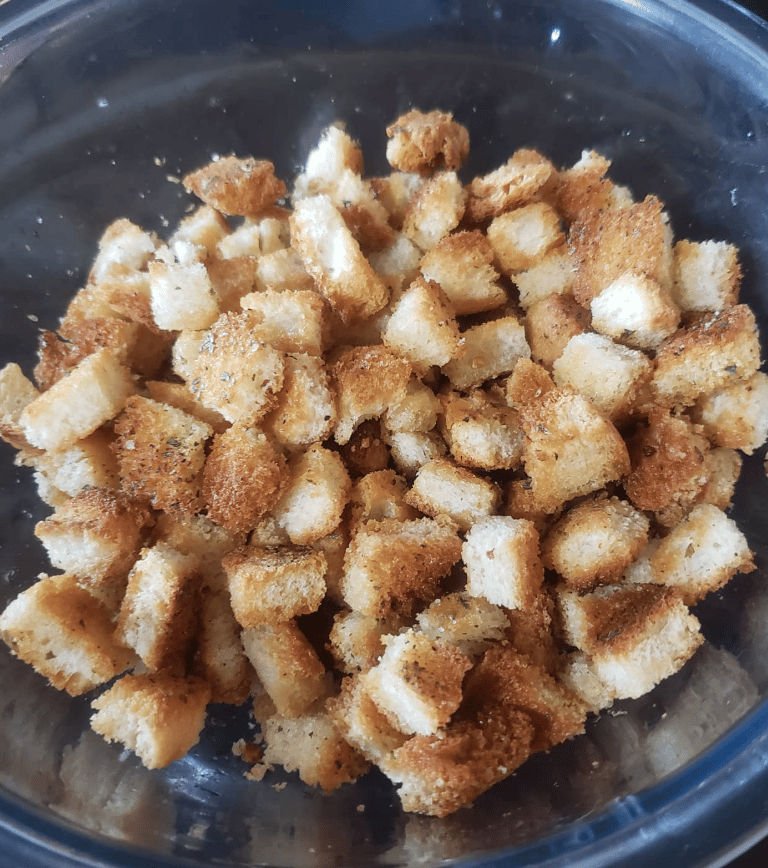 1 punhado generoso de croutons caseiros. Dica: adicione na hora de servir para manter a crocância.